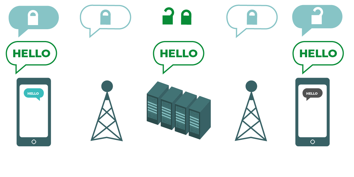 ဒီပုံကားချပ်က အစ-အဆုံးကုဒ်ဖြင့်ပြောင်းလဲခြင်းကို ဆွဲပြထားတာပါ။ ဘယ်ဘက်က စမတ်ဖုန်း ကနေ ကုဒ်နဲ့ပြောင်းလဲမထားတဲ့ “ဟဲလို”ဆိုတဲ့အစိမ်းရောင်မက်ဆေ့ချ်ကို ပို့လိုက်ပါတယ်။ အဲဒီ မက့်ဆေ့ချ်ကို ကုဒ်နဲ့ပြောင်းလဲပြီး ဖုန်းတာဝါနဲ့ ကုမ္ပဏီတာဝါတွေကိုဖြတ်စီးစေပါတယ်။ နောက်ဆုံး မှာတော့ ကုဒ်နဲ့ပြောင်းလဲထားတဲ့မက်ဆေ့ချ်က လက်ခံသူရဲ့ စမတ်ဖုန်းကို ရောက်ရှိသွားတဲ့အခါမှ ပြန်ဖြည်ပေးပြီး “ဟဲလို” လို့ မြင်ရပါမယ်။ သယ်ယူပို့ဆောင်ရေးအလွှာတွင် ကုဒ်ဖြင့်ပြောင်းလဲခြင်း နည်းလမ်းနဲ့ ကွာခြားတာတစ်ခုကတော့ သင့် ISP ဆာဗာတွေမှာ မက်ဆေ့ချ်ကို ပြန်ဖြည်လို့  decrypt လို့မရနိုင်ပါဘူး။ စမှတ်နဲ့ ဆုံးမှတ်ဖြစ်တဲ့ ပေးပို့သူနဲ့ လက်ခံသူနှစ်ဦးမှာသာ ပြန်ဖြည်နိုင်တဲ့သော့တွေရှိပါတယ်။