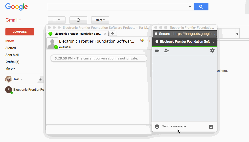 တပြိုင်နက်ထဲမှာပဲ Google Hangouts ချက်ဘောက်စ်မှာ ဘယ်သူမှဖတ်လို့မရတဲ့ ဝှက်စာကြောင်းတစ်ခုကို ပို့လိုက်တာကို တွေ့ရပါတယ်။ ဒါကဘာကိုပြသလဲဆိုရင် Off-the-Record (OTR) ကို အသုံးပြုတဲ့ အစ - အဆုံးကုဒ်ဖြင့်ပြောင်းလဲခြင်းကို အသုံးပြုပြီး ဆက်သွယ်နေတယ်လို့ ဖော်ပြတာဖြစ်ပါတယ်။ OTR  ချက်ဘောက်စ်မှာရေးထည့်တဲ့ မက်ဆေ့ချ်တိုင်းက Google Hangouts ချက်ဘောက်စ် မှာ ဖတ်မရတဲ့စာတွေအဖြစ် ပေါ်လာပါတယ်။ အောက်ကစာကြောင်းကို ဒုတိယလူက စာပြန်ရိုက်ပို့ပါတယ်။